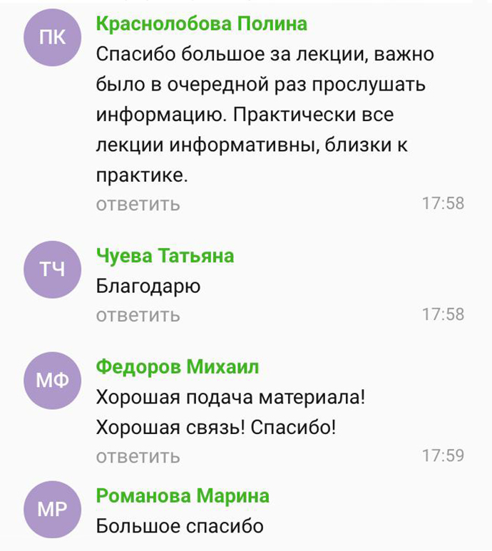 Понравились доклады, манера подачи материала была очень легкой для понимания. Много нового. Зароченцева Н.В. и Пекарев О.Г. - просто супер! Материал разложен по полочкам, все доступно. Все хорошо и четко организовано, особенно возможность быть на двух каналах. Прошу почаще организовывать такие мероприятия.