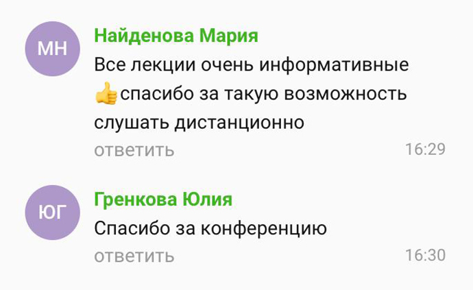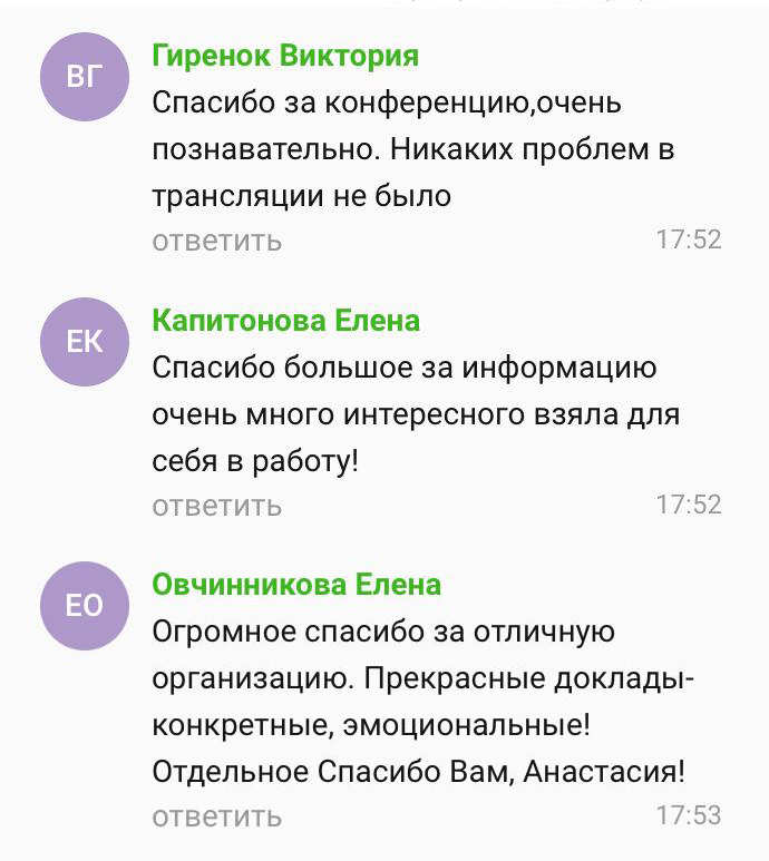 Доклады были очень актуальные, прочитаны на самом высоком уровне. Получила много полезной информации. Хочу отметить прекрасную работу всего коллектива. Все было без перебоев, хорошего качества.